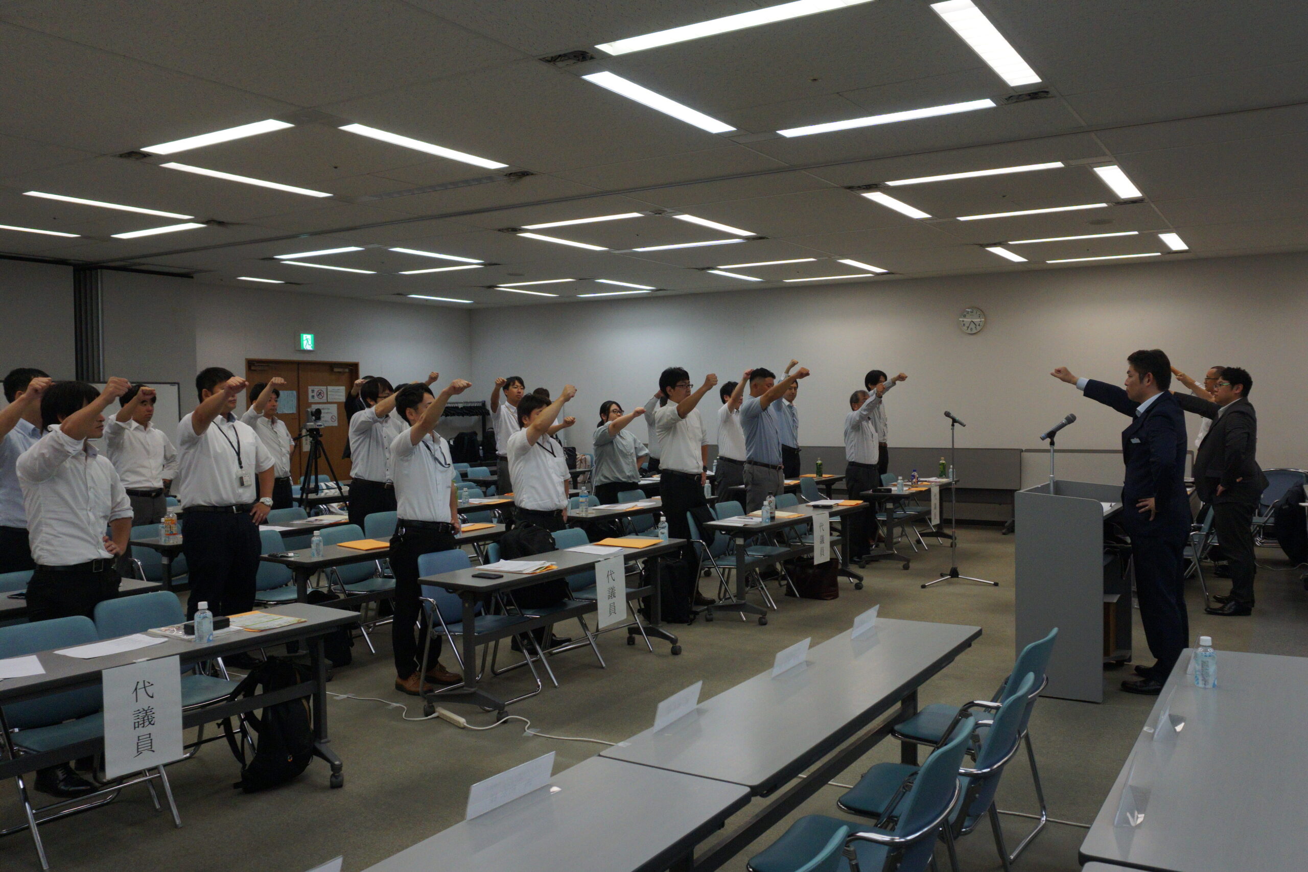開会に先立ち、6月10日(火)に富山県氷見市にて発生した専門交通誘導員の交通死亡事故において、亡くなられた方への黙祷が捧げられた。その後平田中央執行委員による開会挨拶、資格審査の結果報告を受け大会の成立が確認された。その後、議長団には、髙橋代議員(東日本総支部)、澤代議員(西日本総支部)、大会運営委員長には滝田代議員(西日本総支部)が選出された。